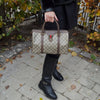 En skøn Boston bag med GG monogram i PVC. Tasken har fine læderdele med almene brugsspor og pæne guldfittings. Inden i har den mindre brugsspor. Intet der påvirker oplevelsen med tasken. Den er rengjort, så den står klar til sin nye ejer.
